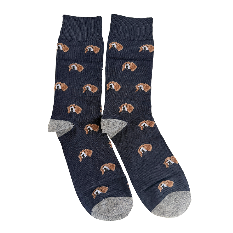Meias de algodão com padrão de beagles, ideais para uso diário. Confortáveis e versáteis, são uma opção prática para quem gosta de adicionar um toque discreto e original ao look.